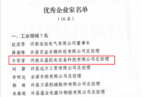 2022年12月30日,許昌市魏都區(qū)人民政府召開了關于魏都區(qū)優(yōu)秀(杰出)企業(yè)和優(yōu)秀(杰出)企業(yè)家表彰大會。河南樂盈機電設備科技有限公司獲評魏都區(qū)工業(yè)領域2022年度優(yōu)秀企業(yè)榮譽稱號,公司總經理牛軍營同志榮獲工業(yè)領域2022年度優(yōu)秀企業(yè)家榮譽稱號。